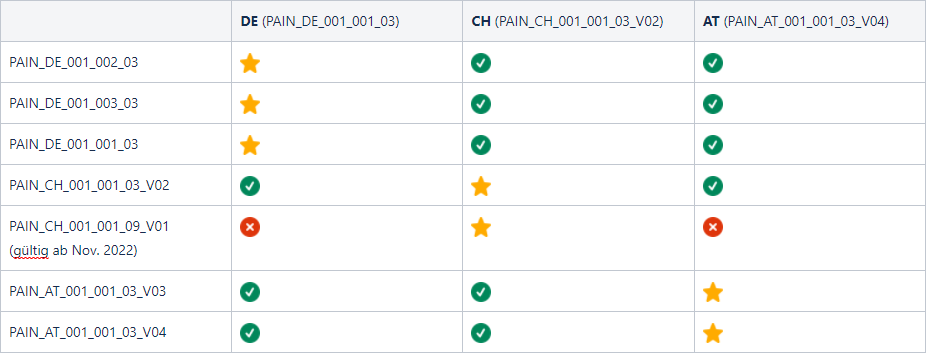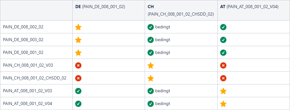 Konvertierung von Zahlungsauftragsdateien in länderspezifische Formate | Automatische Konvertierung von eingereichten SEPA-Zahlungen in das länderspezifische Zielformat. Das Zielformat richtet sich nach dem ISO-Ländercode des jeweiligen EBICS-Kontakts. Hinweis: Aufgrund inhaltlicher Einschränkungen ist die Konvertierung nicht in allen Fällen möglich. Mögliche Konvertierungen sind nachfolgenden Tabellen zu entnehmen: Legende 💛 Eine Konvertierung ist nicht vorgesehen. Das Original-Dokument wird zurückgegeben. ❌ Eine Konvertierung ist nicht möglich (unbekannte pain-Formate oder gravierende Unterschiede in Quelle- und Ziel-XSD-Schema). ✅ Eine Konvertierung ist möglich: u. U. je nach Belegung der Felder können Fehler auftreten. Überweisungen ![]() Lastschriften ![]() |