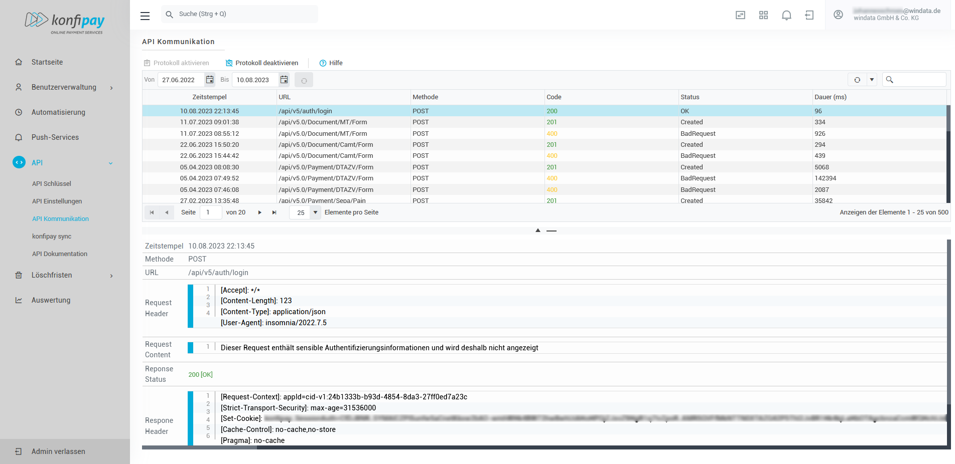 Hier finden Sie ein detailliertes Protokoll der API-Kommunikation Ihres Mandanten. Alle Zugriffe auf die API werden hier mitgeschrieben, Sie können also nachvollziehen, wann welche Interaktion von externen Applikationen mit der API stattgefunden hat und ob diese Interaktion erfolgreich war.