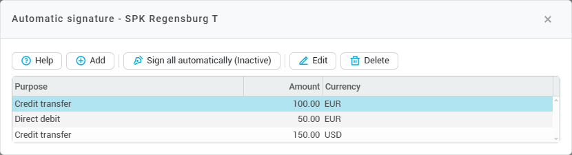 After you click on Automatic Signatures you will see a list of all active rules for this contact. This list is empty the first time you open it, as no rules have been set up yet. Click at the top on Add to create a new rule for this EBICS contact.