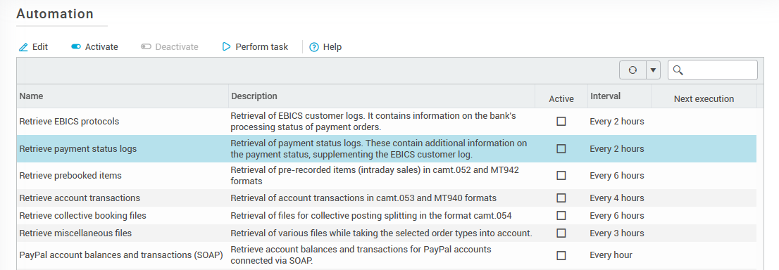 In the overview, you can see all tasks that can be automated. You can activate or deactivate automation for each task and set the interval at which the task is to be repeated. To change the automation interval of a task, select this task in the list and click on Edit.