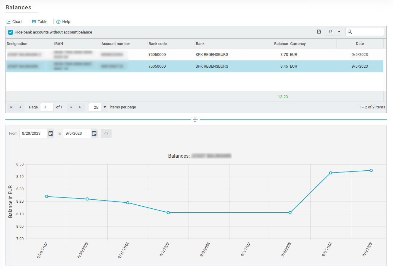 You can display the account balances over time either as a table or as a chart. To do this, select the desired account in the list and click on the corresponding option at the top of the toolbar.