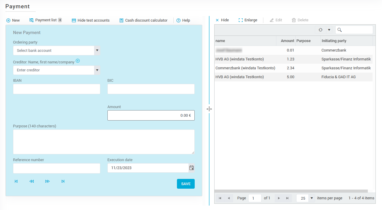 Depending on your requirements, you can also hide or enlarge the transfer form on the left-hand side or the payment list on the right-hand side.