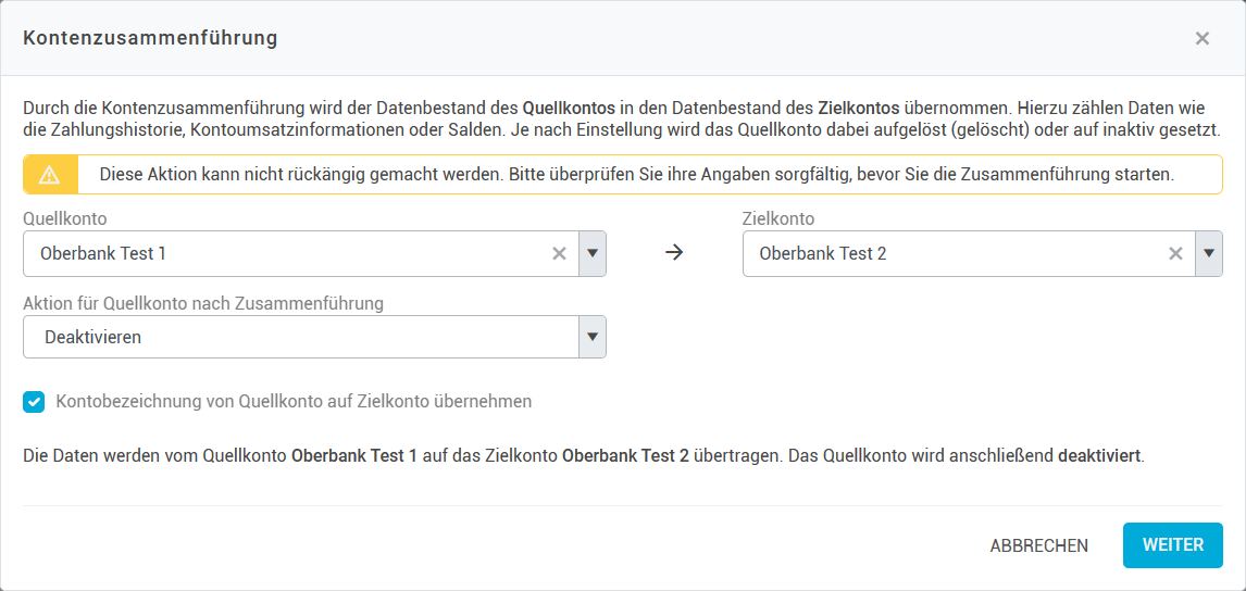 Eine Kontozusammenführung kann nicht rückgängig gemacht werden. Bitte überprüfen Sie ihre Angaben sorgfältig, bevor Sie die Zusammenführung starten.