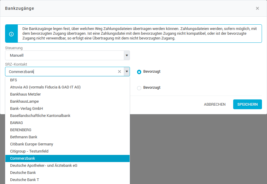 Legen Sie die Steuerung als Manuell fest und wählen Sie beim SRZ-Kontakt die entsprechende Bank aus der Dropdown-Liste aus. Setzen Sie den SRZ-Kontakt außerdem als Bevorzugt fest. Dann wird die Bankenkommunikation für das Konto bevorzugt über den entsprechenden SRZ-Kontakt abgewickelt.