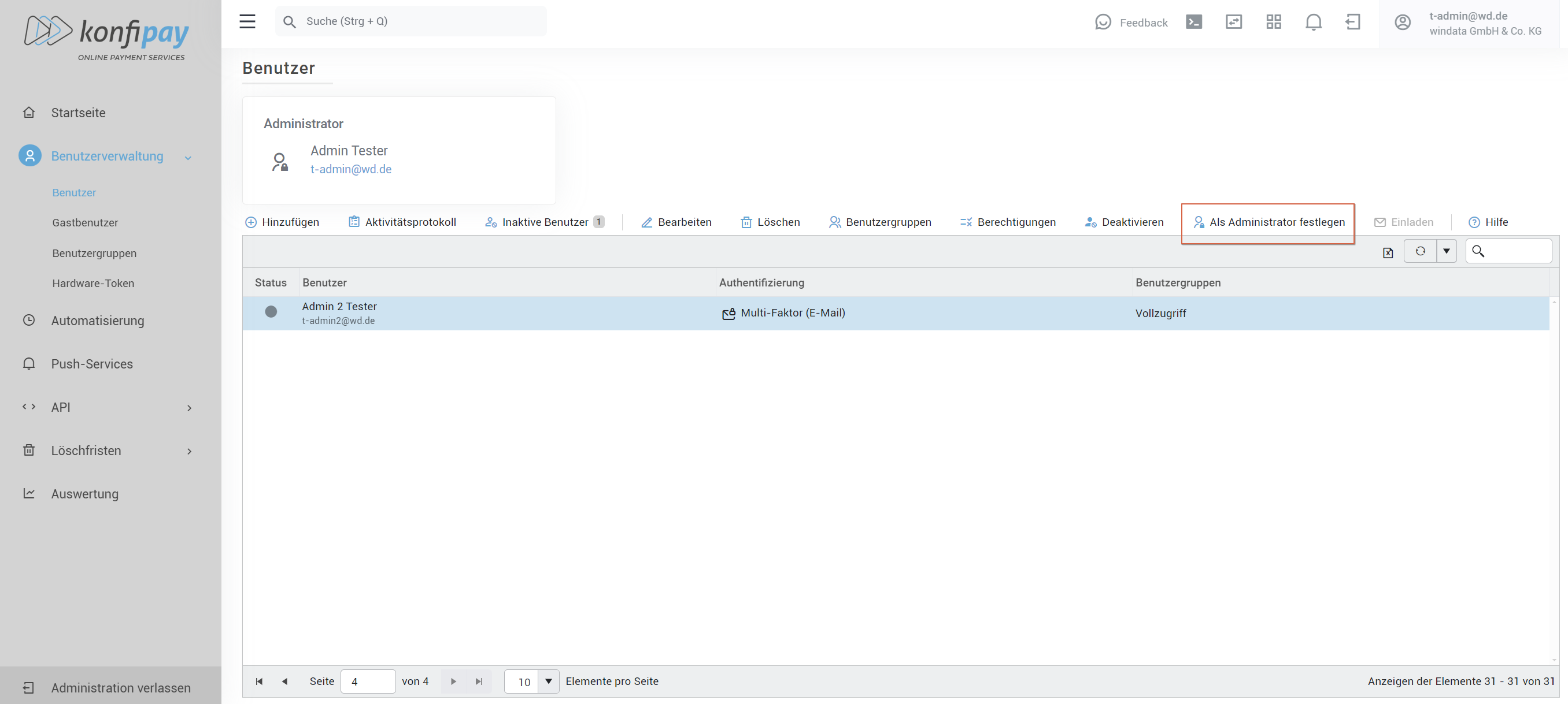 Für jeden Mandant kann nur genau ein Benutzer als Administrator benannt werden. Sofern es notwendig ist, dass ein anderer Benutzer diese Rolle übernimmt, kann die Berechtigung über die Benutzerverwaltung an einen anderen Benutzer übertragen werden.