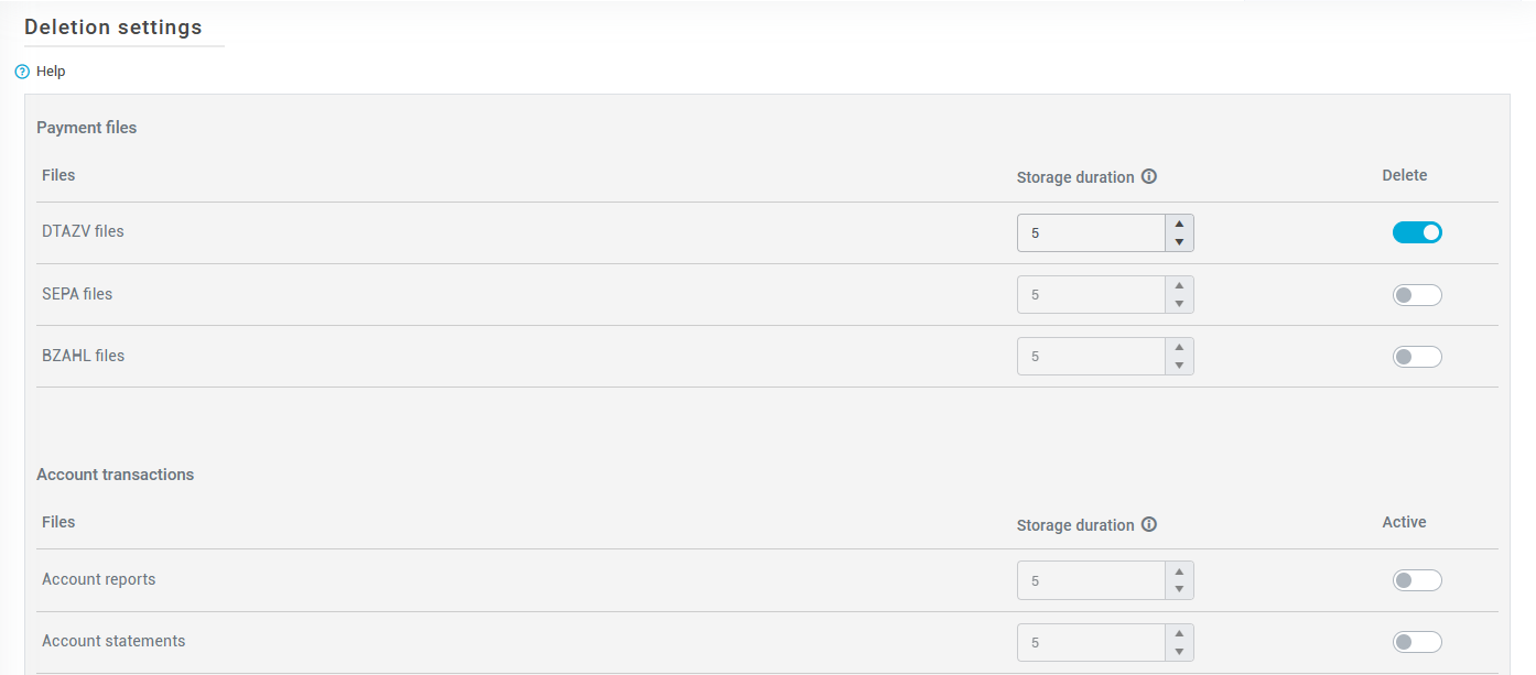 Deletion periods can be activated and set individually for each file type. Define the desired storage period, i.e. the time after which the corresponding files should be deleted. For account transactions and PayPal transactions, you also have the option of only deleting files that have already been retrieved by the API.