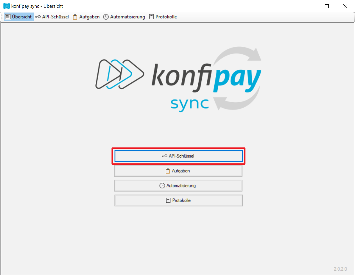 Um in konfipay sync die API-Verbindung erstmals einzurichten, klicken Sie nach dem Starten zunächst auf API-Schlüssel.
