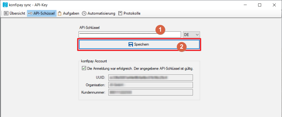 Fügen Sie dann in das Textfeld den API-Schlüssel ein, den Sie für konfipay sync nutzen wollen, und klicken Sie auf Speichern. Wenn der API-Schlüssel korrekt ist, werden die Daten Ihres Mandanten angezeigt.