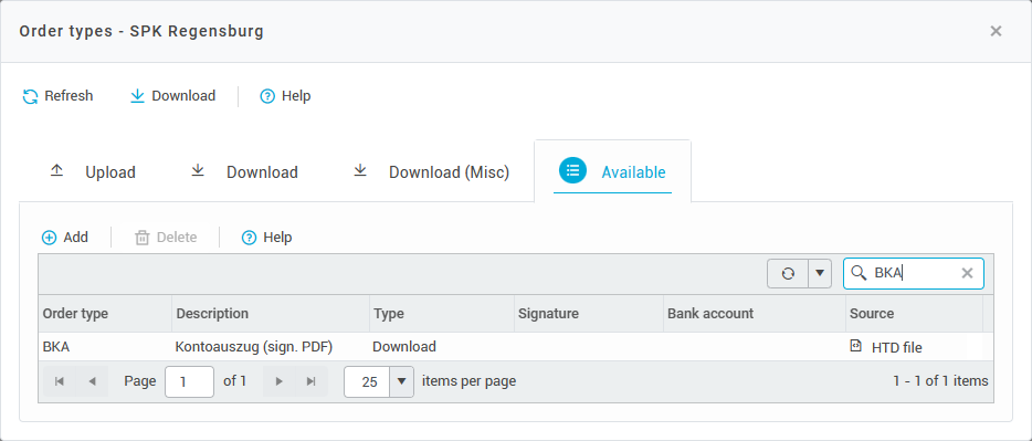 Then select the “Available” tab and filter for the desired order type using the search mask. If you cannot find the order type here, it is not provided by your bank. In this case, please contact your bank to have the order type activated. The search in the available order types is shown here using the example "BKA":