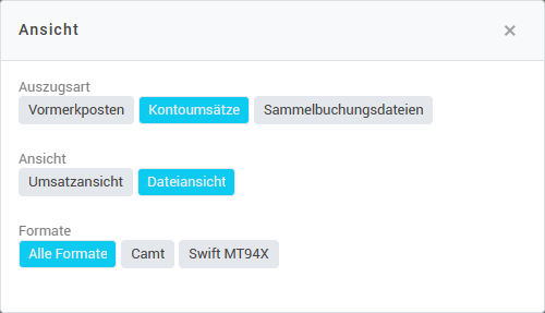 Wählen Sie in der oberen Liste das fragliche Bankkonto aus. Stellen Sie ggf. auf Dateiansicht um, indem Sie ganz oben auf die drei grauen Wörter klicken und unter “Ansicht” auf Dateiansicht umstellen: