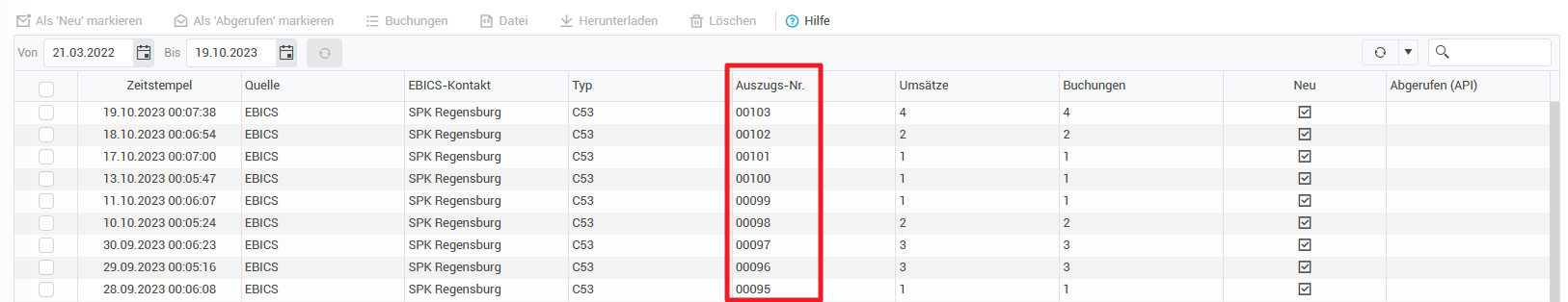 Achten Sie dann auf die Spalte “Auszugs-Nr.“ und prüfen Sie, ob eine Nummer in der laufenden Nummerierung fehlt: