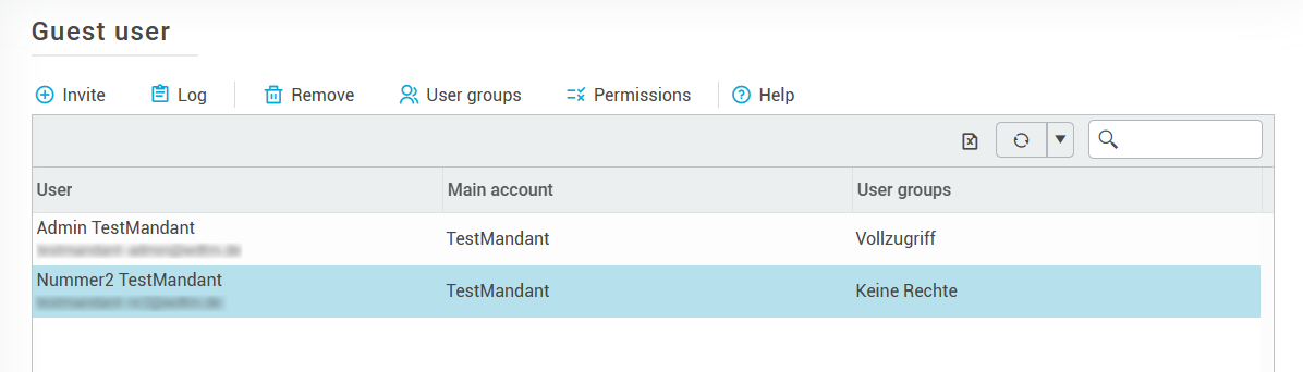 Display the permissions of a guest user by selecting the corresponding guest in the list and then clicking on Permissions. You will then see the user group to which the guest belongs on the left and a permission matrix with the guest's corresponding permissions on the right.
