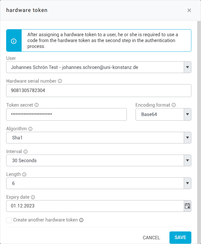 The expiration date is for information purposes only and represents the lifetime of the hardware token battery expected by the manufacturer. This information can also be found in the accompanying documents. If the expiration date is properly entered, you can quickly see in the future which hardware tokens need to be replaced due to their age.