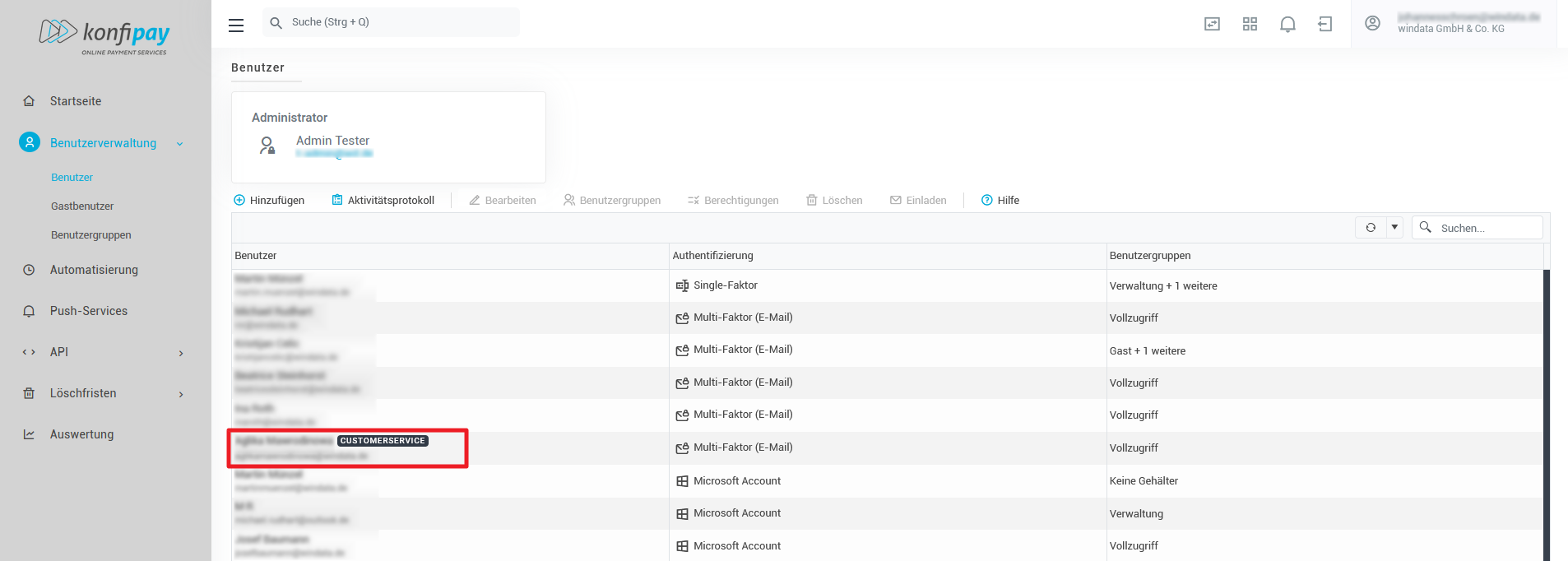 In der Benutzerliste Ihres Mandanten können Sie einsehen, ob Sie einen permanenten konfipay-Kundenberater haben. Der Name ist mit dem Vermerk Customer Service versehen: