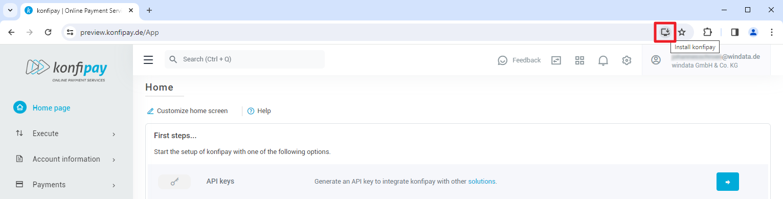 If you use a supported browser (Microsoft Edge or Google Chrome), you can install konfipay on your PC as a Progressive Web App (PWA). You will then continue to access the konfipay website, but you will have the feeling of working in a desktop app. The konfipay PWA is then automatically pinned to your taskbar and offers optimized performance.