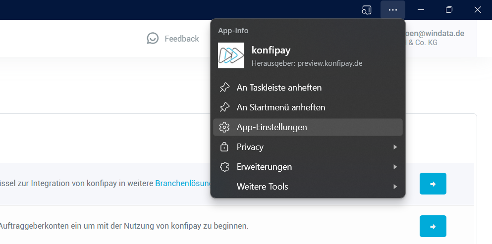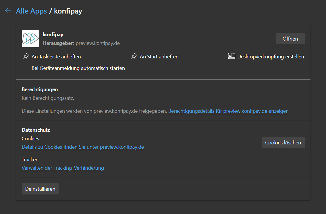 Wenn Sie einen unterstützten Browser (Microsoft Edge oder Google Chrome) nutzen, können Sie konfipay auf Ihrem PC als Progressive Web App (PWA) installieren. Dann greifen Sie weiterhin auf die konfipay-Webseite zu, haben aber das Gefühl, in einer Desktop-App zu arbeiten. Die konfipay-PWA wird dann automatisch an Ihre Taskleiste angeheftet und bietet eine optimierte Performance.