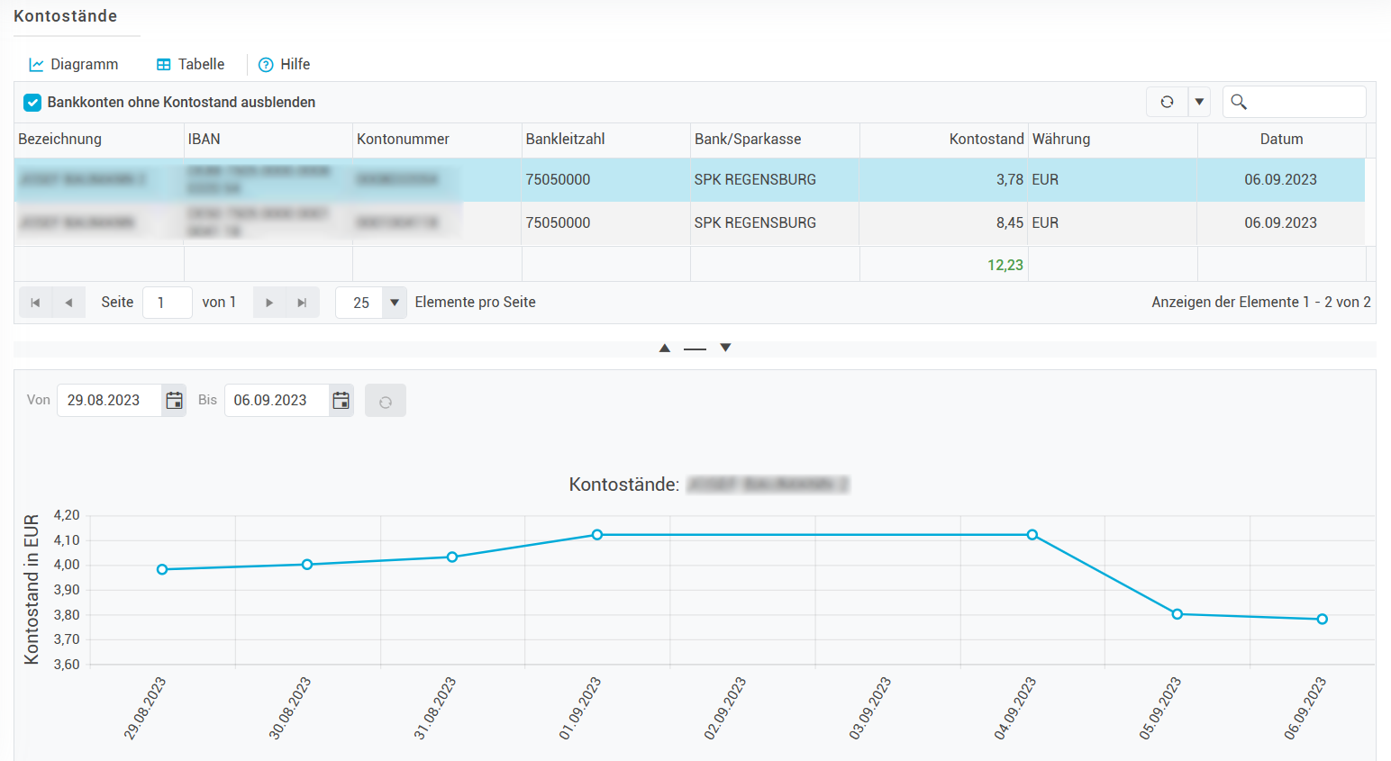 Hier können Sie die aktuellen Kontostände für die Bankkonten Ihres Mandanten einsehen. Wählen Sie in der oberen Liste ein Konto aus, um die Kontostände im zeitlichen Verlauf zu sehen.