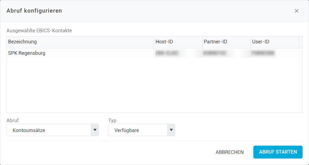 Um Umsatzdateien von Ihrer Bank abzurufen, wählen Sie in der Liste den EBICS-Kontakt aus, für den Sie den Abruf starten möchten. Wenn kein Kontakt ausgewählt ist, werden automatisch alle verfügbaren Kontakte für den Abruf ausgewählt.