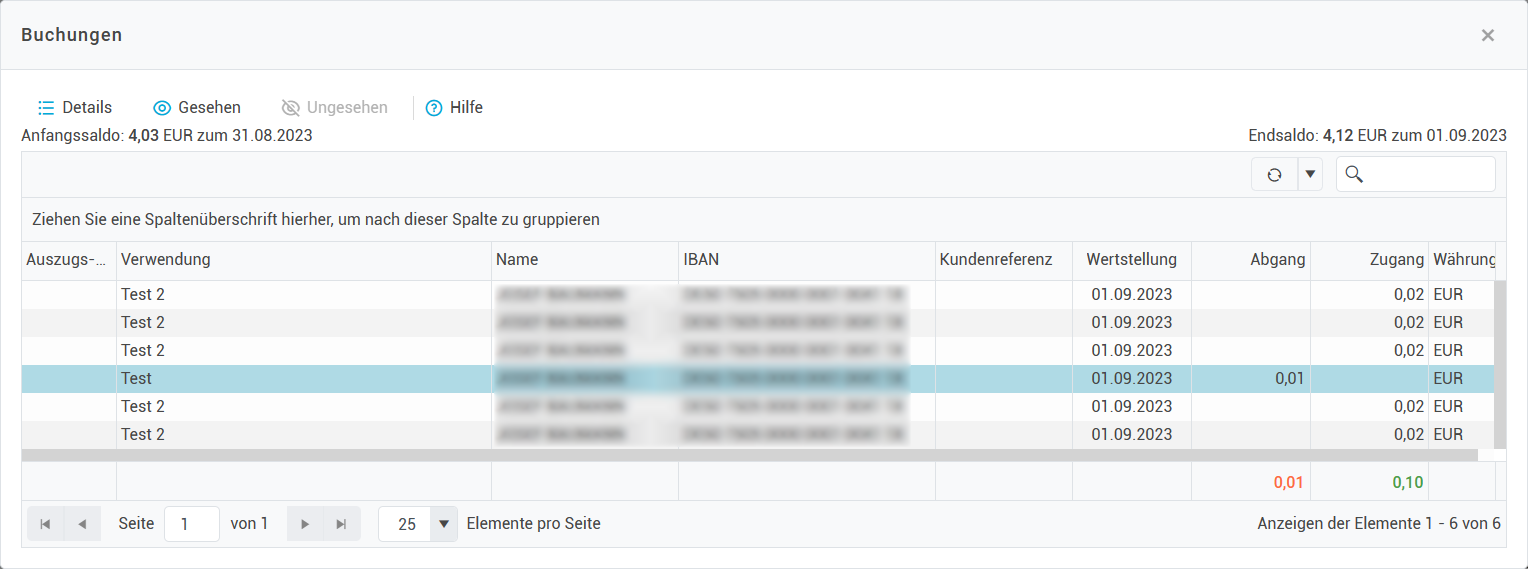 Mit Gesehen bzw. Ungesehen in der Toolbar können Sie einen Umsatz entsprechend markieren, um für Sie und Ihre Kollegen festzuhalten, dass Sie ihn bereits zur Kenntnis genommen haben.