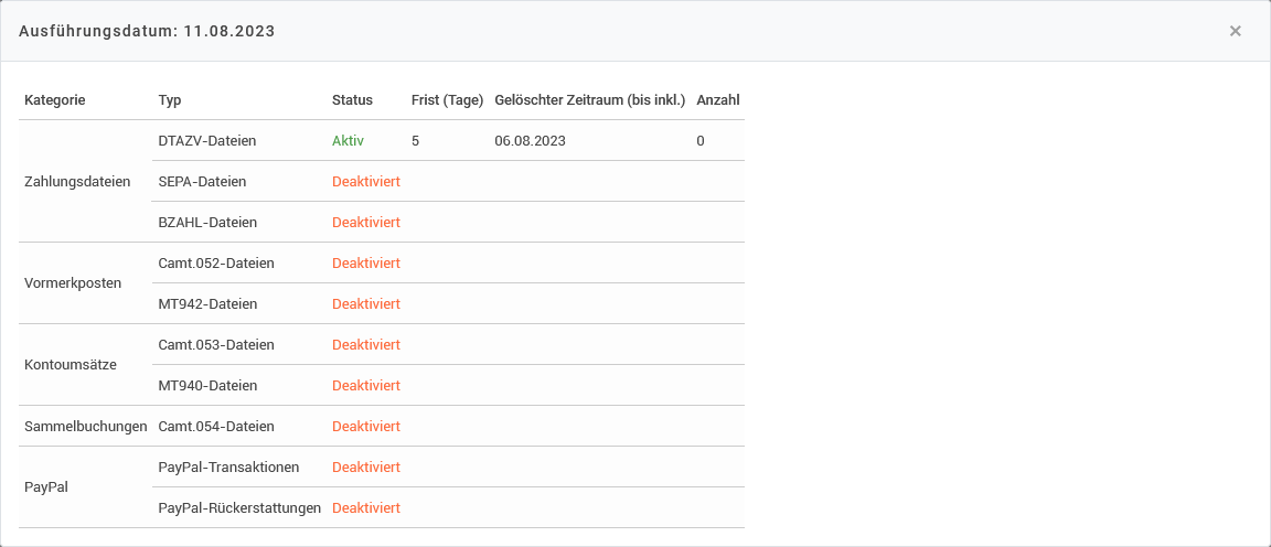 Löschung vom 11.08.: Es war nur die DTAZV-Löschung aktiv, und es wurden keine Dateien gelöscht.