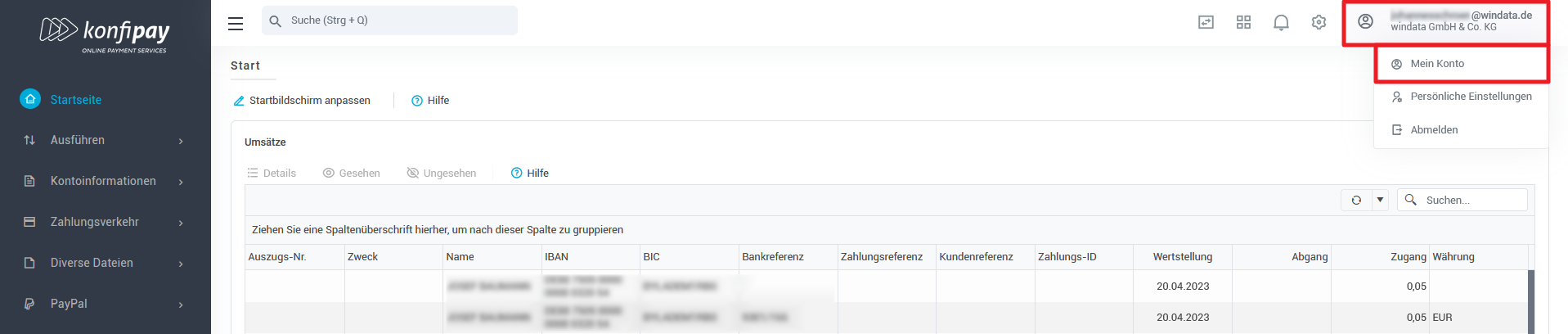 Unter Mein Konto können Sie Informationen zu Ihrem konfipay-Benutzerkonto einsehen und anpassen. Sie können jederzeit am rechten oberen Bildschirmrand auf Ihre E-Mail-Adresse klicken und dann auf Mein Konto, um den Bereich zu erreichen: