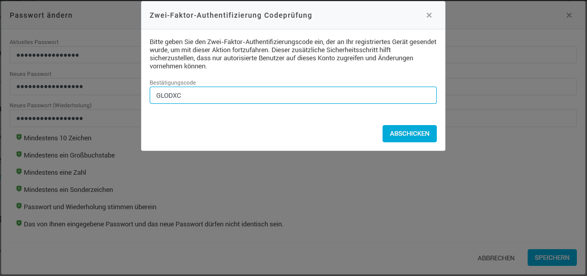 Klicken Sie in der Toolbar auf Passwort ändern. Geben Sie dann zuerst Ihr aktuelles Passwort ein und dann zweimal das gewünschte neue Passwort. Bestätigen Sie Ihre Eingaben mit Speichern und geben Sie anschließend den Bestätigungscode ein, der automatisch an Ihre E-Mail-Adresse gesendet wurde. Bestätigen Sie alles mit Abschicken.