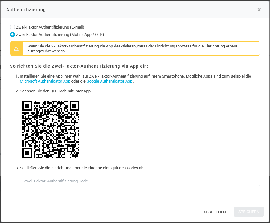 Die Zwei-Faktor-Authentifizierung per App/OTP erfolgt über eine Drittanbieter-App, die Sie zuerst auf Ihrem Smartphone installieren müssen. Scannen Sie dann den in konfipay angezeigten QR-Code mit der App, und geben Sie zuletzt einen Authentifikations-Code aus der App im entsprechenden Fenster ein. Dann schließen Sie die Einrichtung mit Speichern ab.