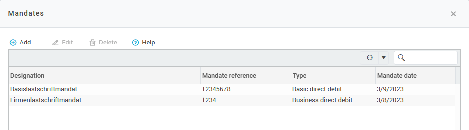 To edit or delete a mandate, select the mandate in the list and click on Edit or Delete. You can then easily select the mandates stored here when creating a direct debit.