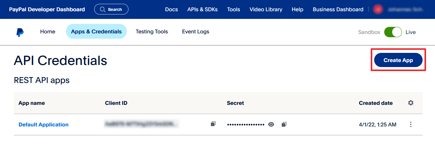 Für die Einrichtung über REST benötigen Sie die Client ID und das Client Secret Ihres PayPal-Accounts. Diese erhalten Sie wie folgt: