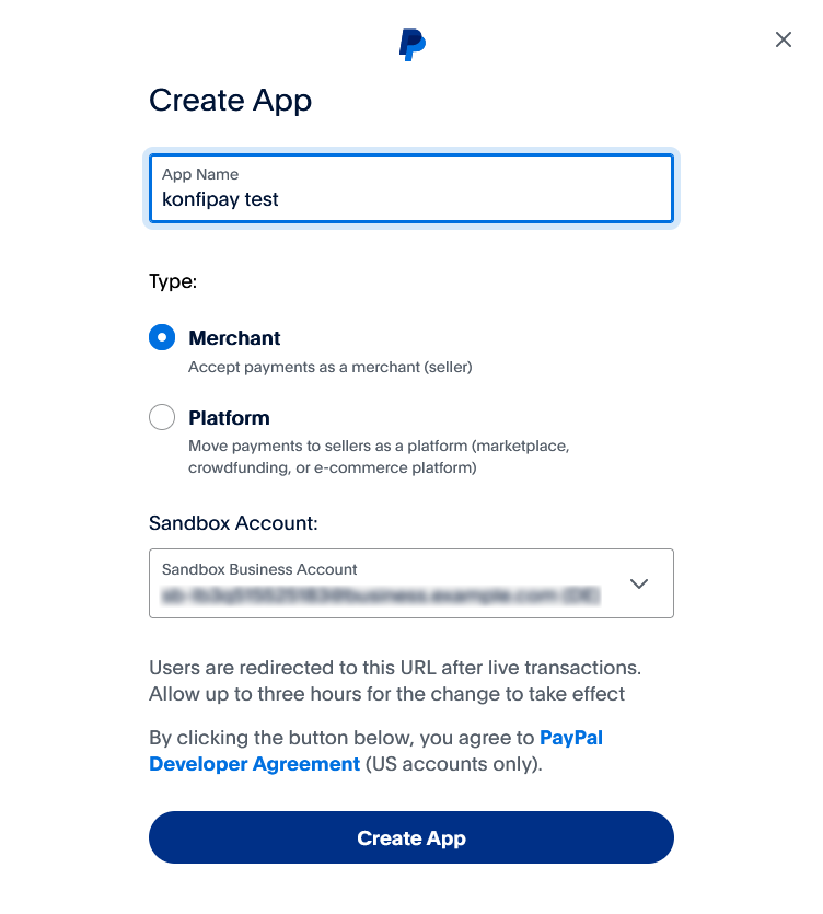 | 6 | Vergeben Sie einen App-Namen (z.B. konfipay), wählen Sie als Typ “Merchant“ aus und bestätigen Sie den Vorgang mit Create App. | ![]() |