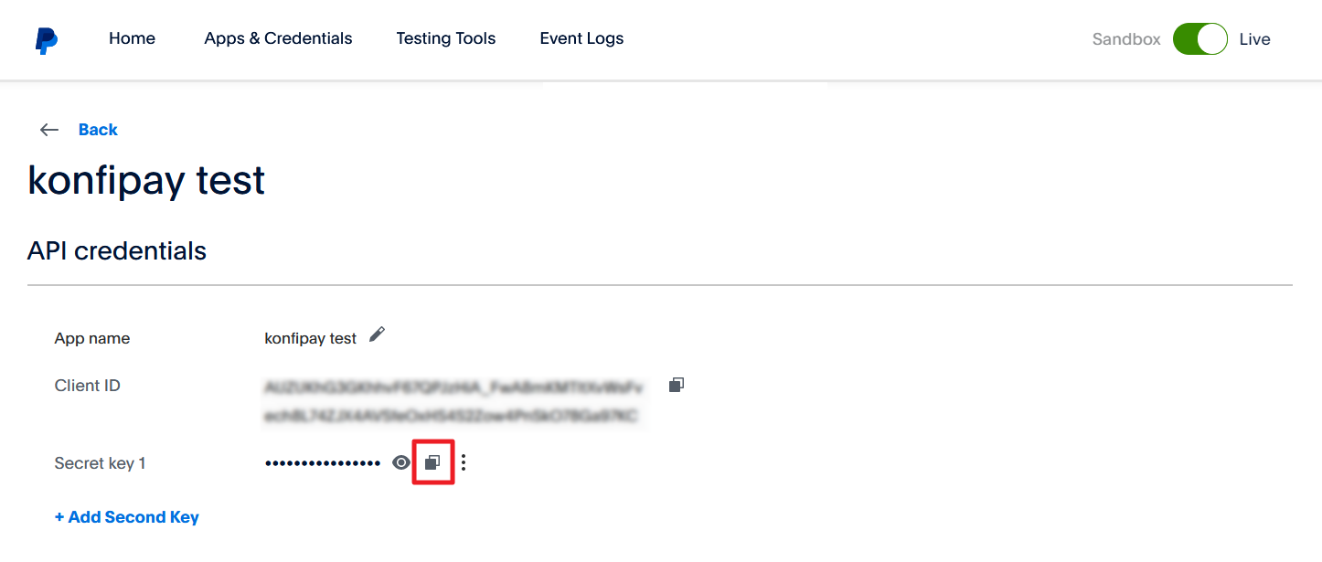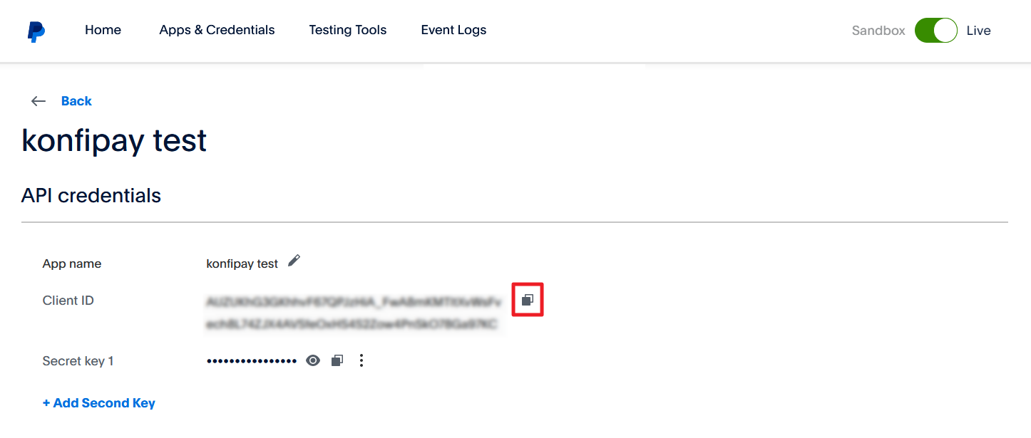 | 10 | Wechseln Sie zu PayPal. Fügen Sie die ID in konfipay im Feld Client ID ein. | ![]() |
