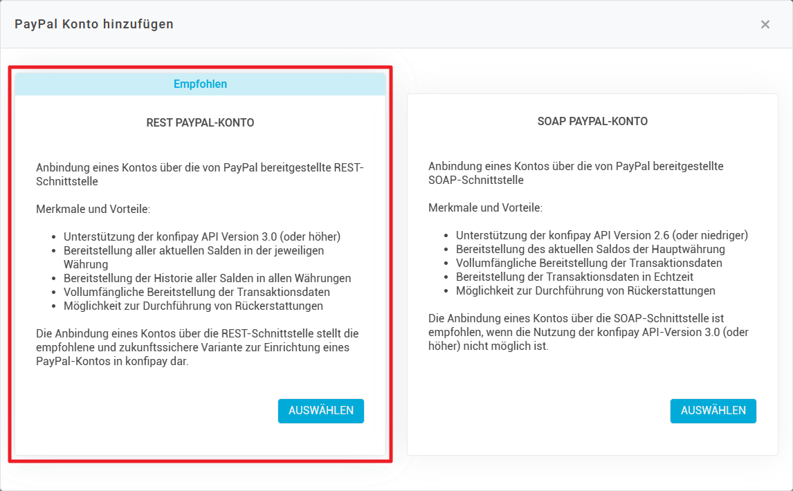 | 8 | Um das PayPal-Konto nun in konfipay anzubinden, wählen Sie in konfipay links in der Navigationsleiste “PayPal” > “PayPal-Konten”, danach oben in der Toolbar Wählen Sie dann die linke Option zum Hinzufügen eines REST PayPal-Kontos. | ![]() ![]() |