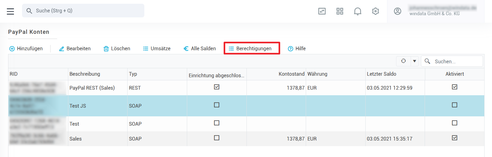 Zugang zur Berechtigungsmaske für SOAP-Konto