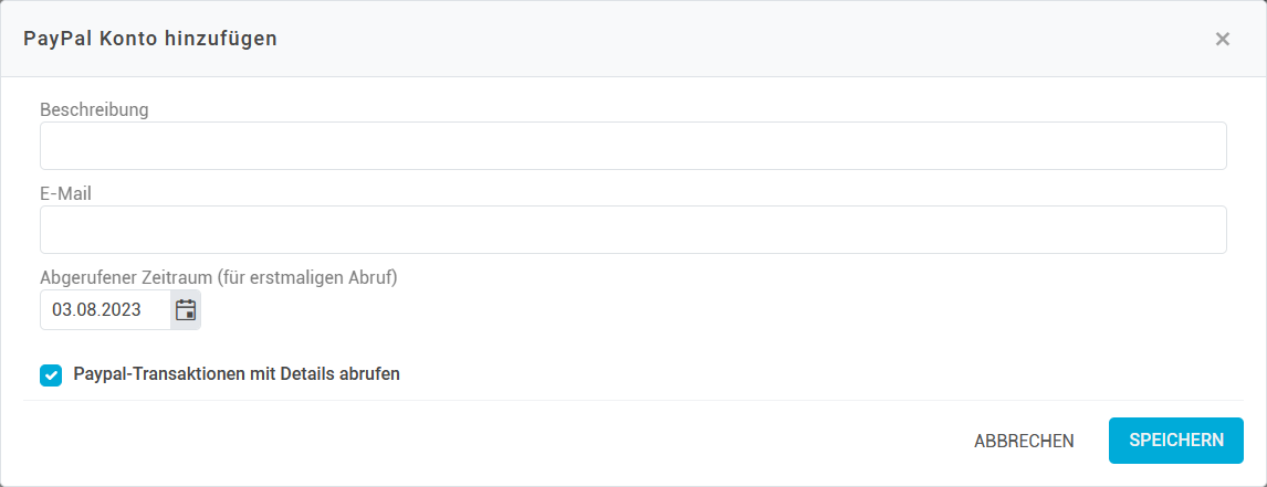 Für die Anbindung über SOAP benötigen Sie zunächst nur die E-Mail-Adresse des PayPal-Kontos. Klicken Sie links oben auf Hinzufügen. Wählen Sie dann rechts SOAP PayPal-Konto aus und vergeben Sie eine eindeutige Bezeichnung für das Konto. Das Feld Abgerufener Zeitraum legt fest, für welchen Zeitraum in der Vergangenheit Transaktionsdaten abgerufen werden. Es kann außerdem unterschieden werden, ob nur Transaktionen oder Transaktionen & Details abgerufen werden sollen.