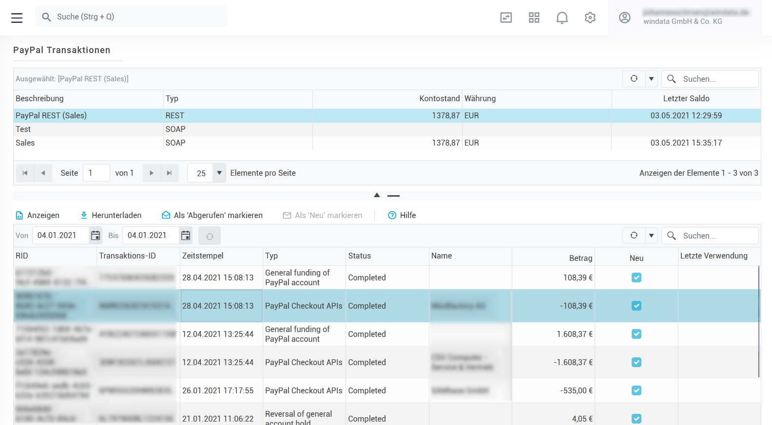 Here you will find all transactions for the connected PayPal accounts. In the top list, first select the account for which you want to display the transactions. The corresponding transactions are then displayed in the lower list. You can mark a selected transaction and display or download the transaction file.