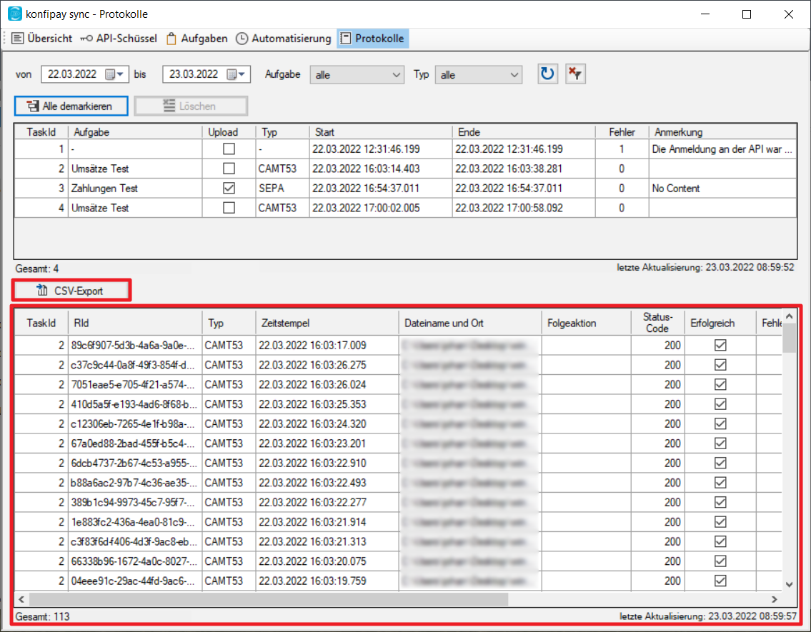 The top window provides an overview of all tasks in konfipay sync. The tasks can be narrowed down with a filter using the date or the task type.