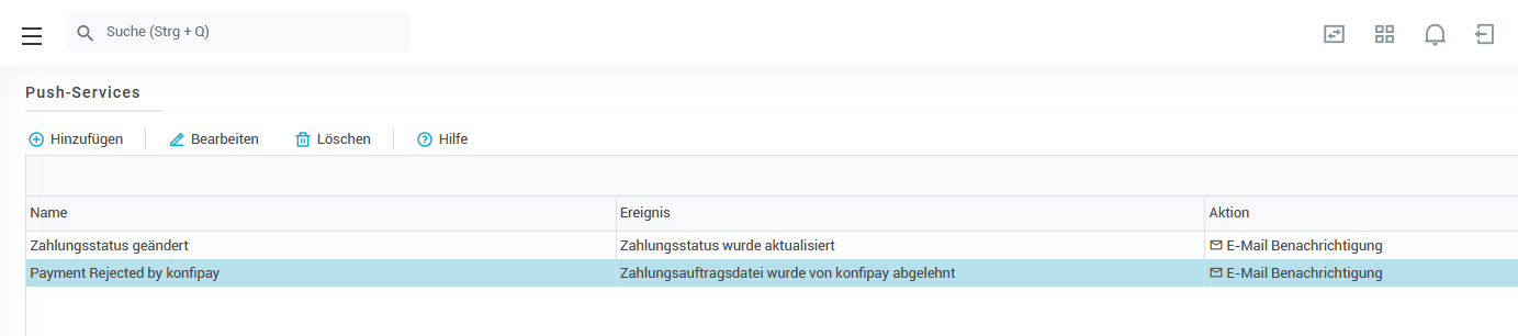 Die Push Services ermöglichen es, dass Sie bei bestimmten Ereignissen in konfipay über eine Push-Benachrichtigung per E-Mail informiert werden. Um eine Benachrichtigungsregel zu bearbeiten oder zu entfernen, wählen Sie diese in der Liste aus und klicken oben in der Toolbar auf Bearbeiten oder Löschen: