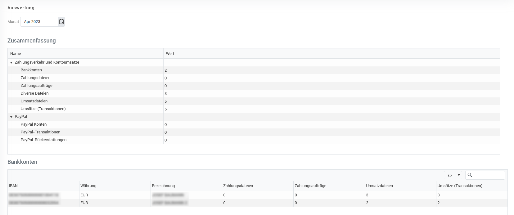 Unter Bankkonten sehen Sie pro Konto einzeln aufgeschlüsselt, wie viele Zahlungsdateien im entsprechenden Monat versendet wurden: