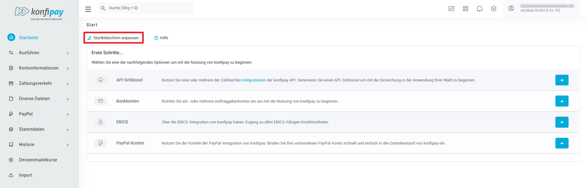 Wenn die Startseite nicht personalisiert wurde, werden erste Schritte in konfipay vorgeschlagen. Um den Bearbeitungsmodus zu starten und Elemente hinzuzufügen, klicken Sie in der Toolbar auf Startbildschirm anpassen: