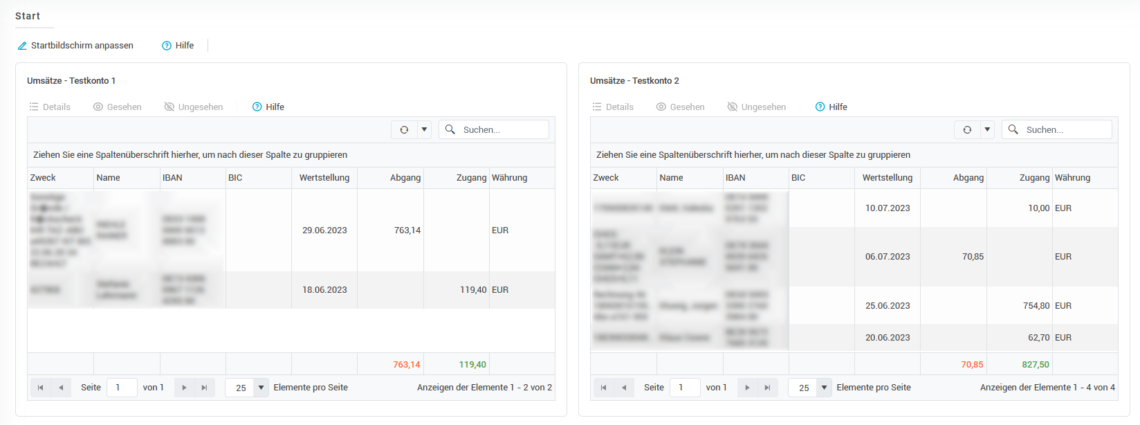 Einrichtungsbeispiel: Kontoumsätze auf der Startseite anzeigen