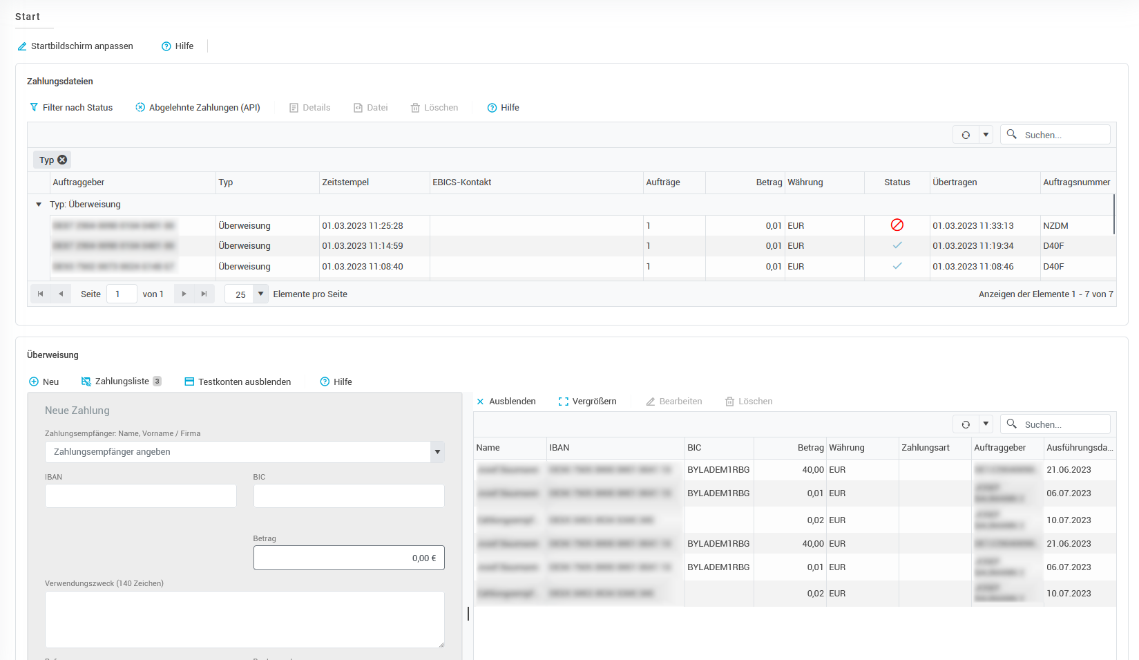 Lassen Sie sich oben die letzten ausgehenden Zahlungen anzeigen und halten Sie darunter die Überweisungsmaske parat: