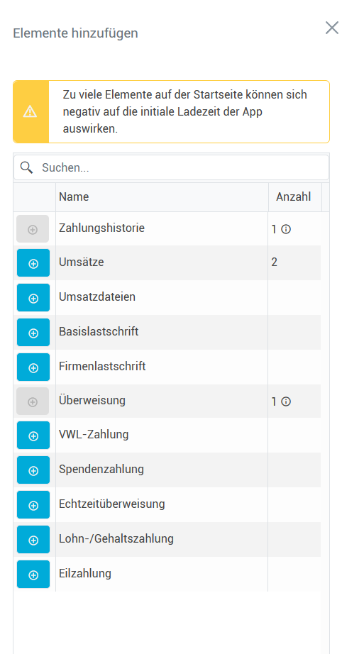 Im Bearbeitungsmodus klicken Sie oben in der Toolbar auf Elemente hinzufügen, um den Startbildschirm zu füllen. Wählen Sie dann rechts die gewünschten Elemente mit dem “Plus-Symbol” aus. Um ein Element mehr als einmal hinzuzufügen, klicken Sie mehrfach auf das “Plus-Symbol”: Wenn Sie die gewünschten Elemente hinzugefügt haben, schließen Sie die Maske mit dem “X“ rechts oben: