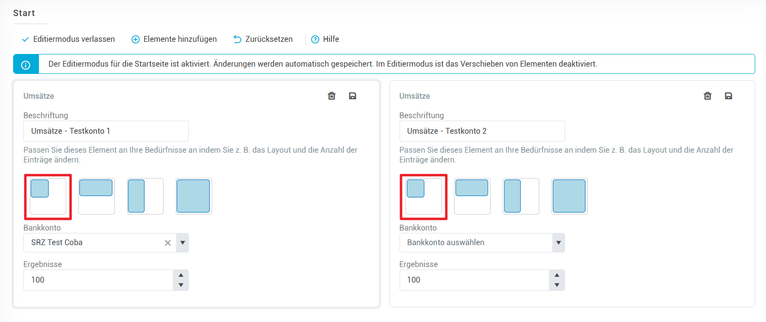 Für Kontoumsätze beispielsweise vergeben Sie eine Bezeichnung, legen die Größe des Fensters fest und wählen das anzuzeigende Bankkonto aus der Dropdown-Liste aus. Speichern Sie Ihre Einstellungen, indem Sie entweder auf das Diskettensymbol rechts oben klicken oder in der Toolbar auf Editiermodus verlassen: