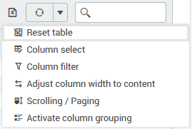 To access the other table functions, click on the small arrow next to the refresh icon - the following drop-down list will then open: