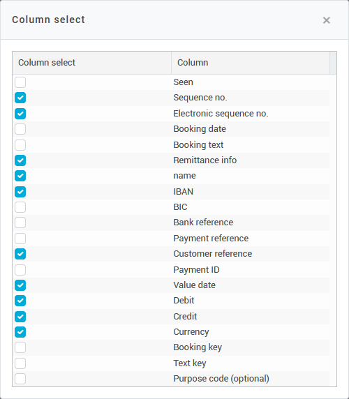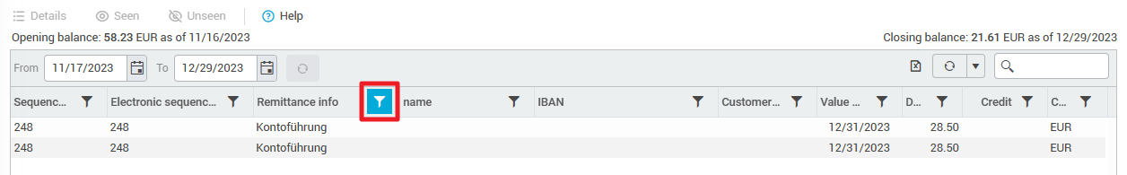 In the example, the table entries are grouped by the electronic sequence number - all payments with no. 220 are displayed first and ascending sequence numbers afterwards. However, the principle also works for any other column. It is even possible to group by several columns simultaneously, e.g. by currency and payment type - then, for example, all EUR transfers would be displayed first, then EUR direct debits, then CHF transfers, and then CHF direct debits.