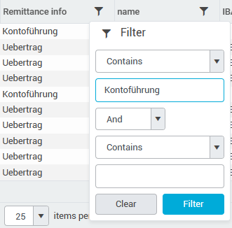 When a Column filter is activated, a filter symbol is displayed for each column. A content filter can then be set for the corresponding column by clicking on the symbol (similar to Microsoft Excel) and confirming by clicking Filter: