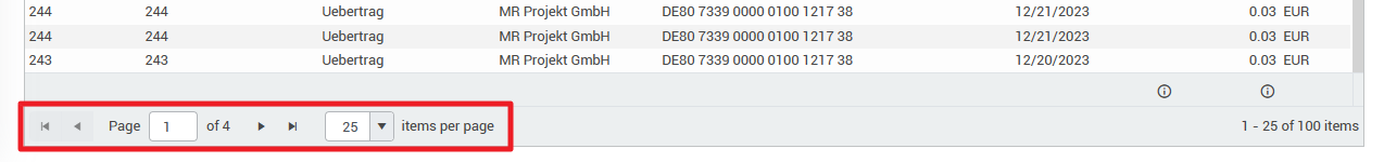 With Paging active, only 25 entries are displayed on a page, for example, and to display further entries, the view must be switched to the next page using a bar at the bottom of the table: