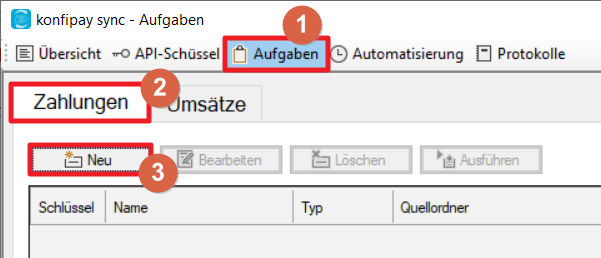 To execute a created task manually, this task must be marked in konfipay sync and executed via Execute.