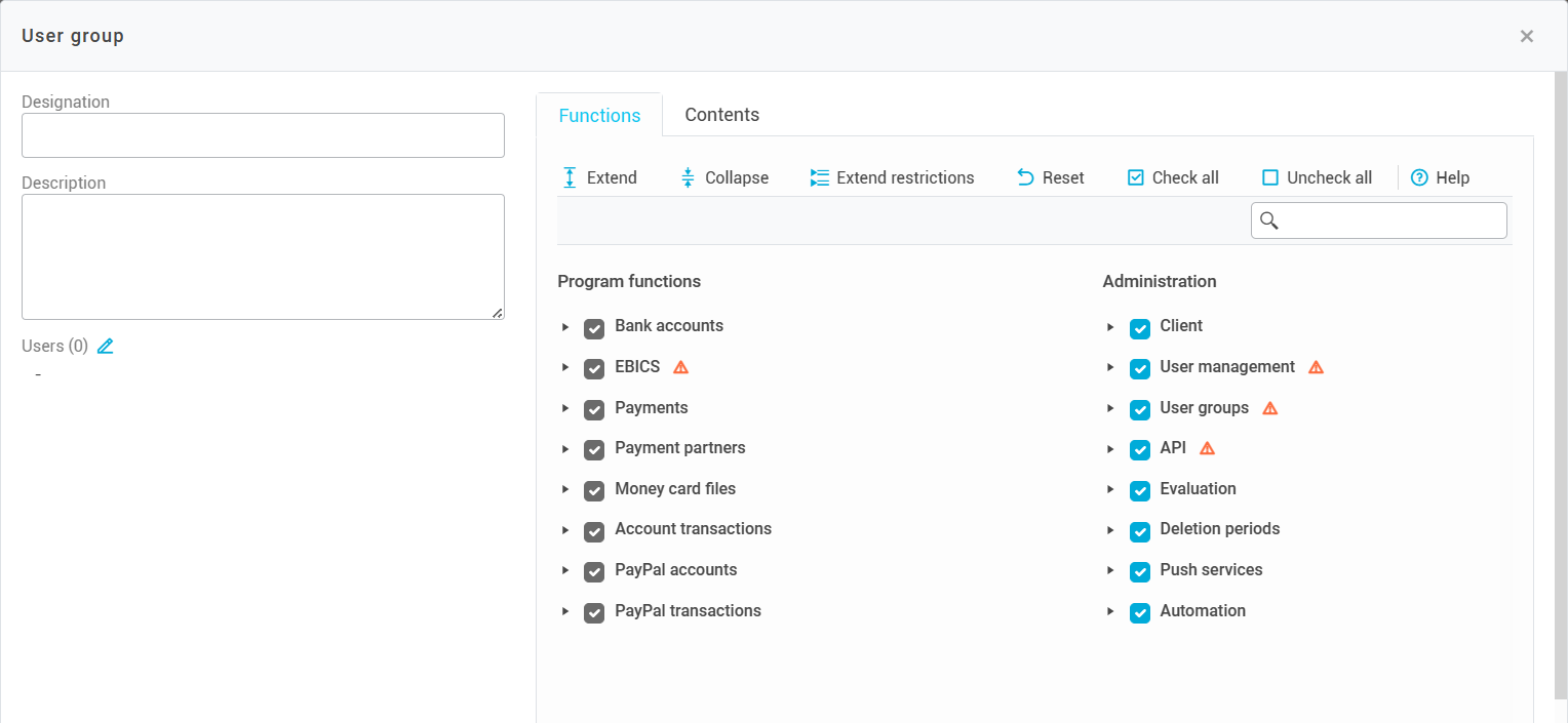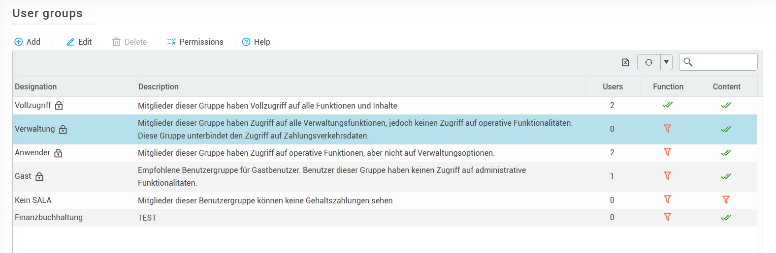 Every regular user of a konfipay client must belong to at least one user group. User groups determine which permissions the members of this group have in the corresponding client.