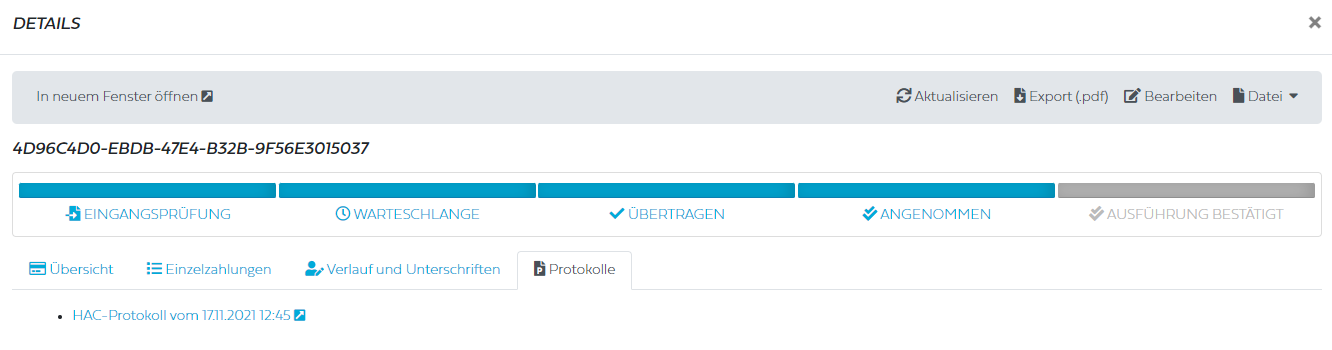 Vollständiger Unterschriftenverlauf bei mehreren Protokolldateien: Bisher wurde für jede Zahlungsauftragsdatei nur das neueste Protokoll berücksichtigt. Dies hatte zur Folge, dass der Unterschriftenverlauf lückenhaft war oder gänzlich verloren ging. Ab diesem Update werden alle Protokolle zu einer Zahlungsauftragsdatei berücksichtigt. Die zu einer Zahlungsauftragsdatei gehörigen Protokolle können in einem neuen Reiter in den Zahlungsdetails eingesehen werden.
